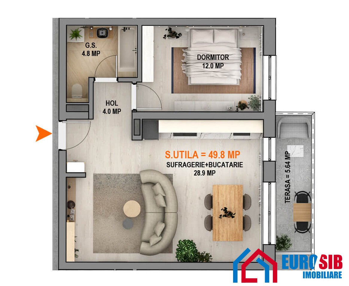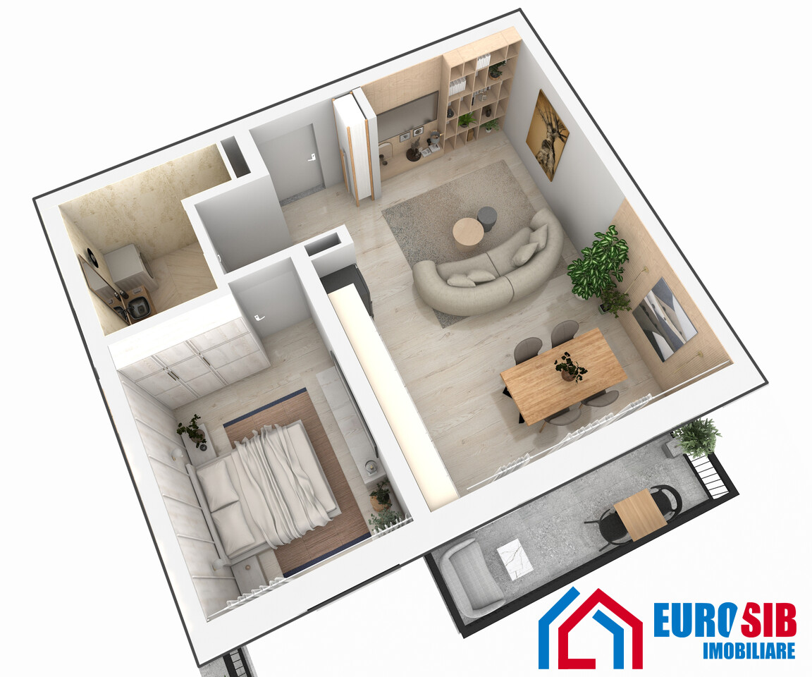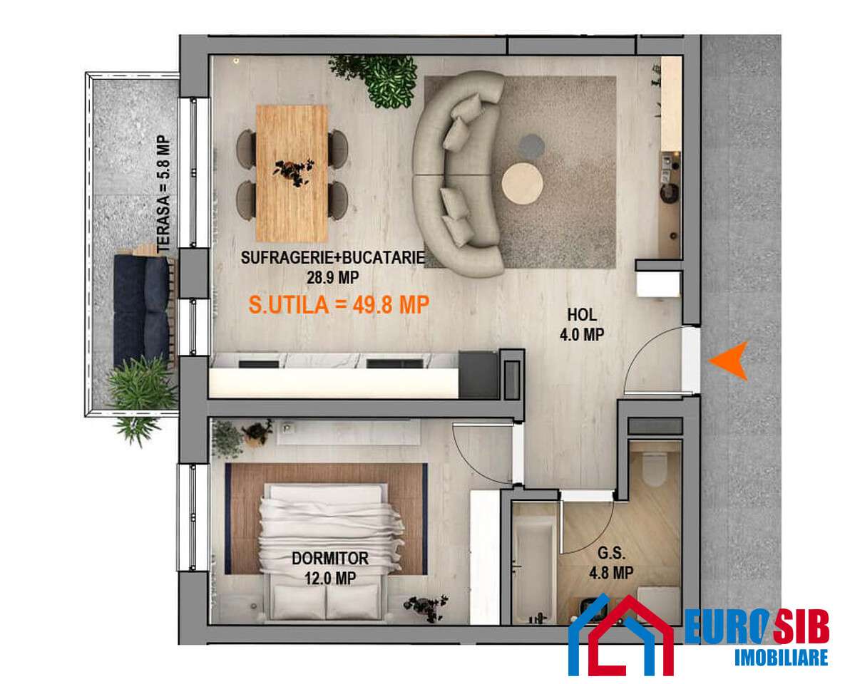 Apartamentul cu 2 camere Tip B1 are o suprafață utilă de 49,8 mp, la care se adaugă un balcon de 5,8 mp, ideal pentru momentele tale de relaxare.